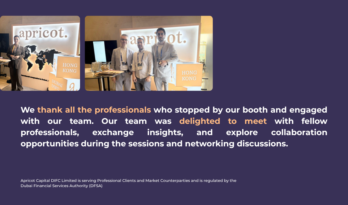 Throughout the conference, the Apricot Capital DIFC Limited team was pleased to meet with industry peers, exchange insights, and explore avenues for future collaboration. We thank all the professionals who visited our booth and engaged in productive discussions during the sessions and networking events.